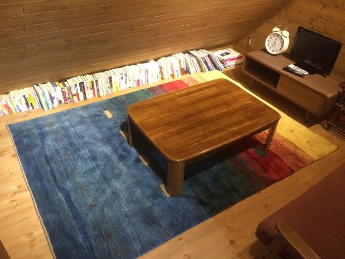 ギャッベの横にはお客様のアイディアでたくさんの本がずら~っと並んでいます。素敵な空間ですね!本を読んだり、テレビを観たり、家族が集まる空間になりそう♪ギャッベで心も身体も温かくしてお過ごしください♪