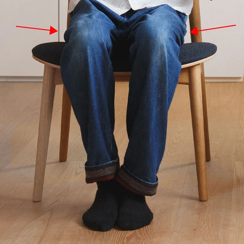 カーブのかかったゆったりした座面のおかげで、中央に向かって自然に足が内側に。無駄な力が入らないので、座っていてとても楽です。