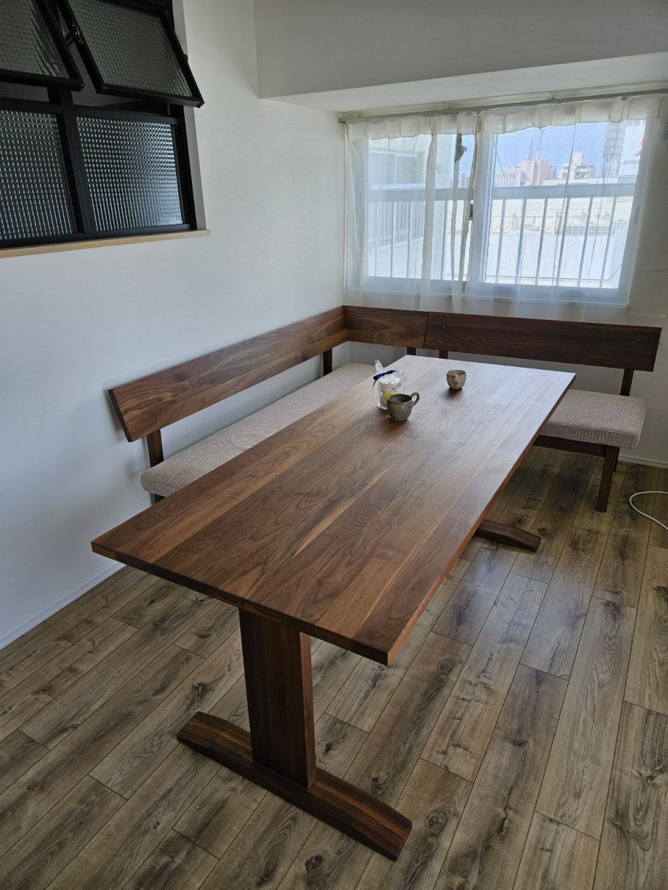 今回お届けしたのは、T字脚のテーブルと、ご飯を食べた後もゆったりくつろげるベンチソファ。