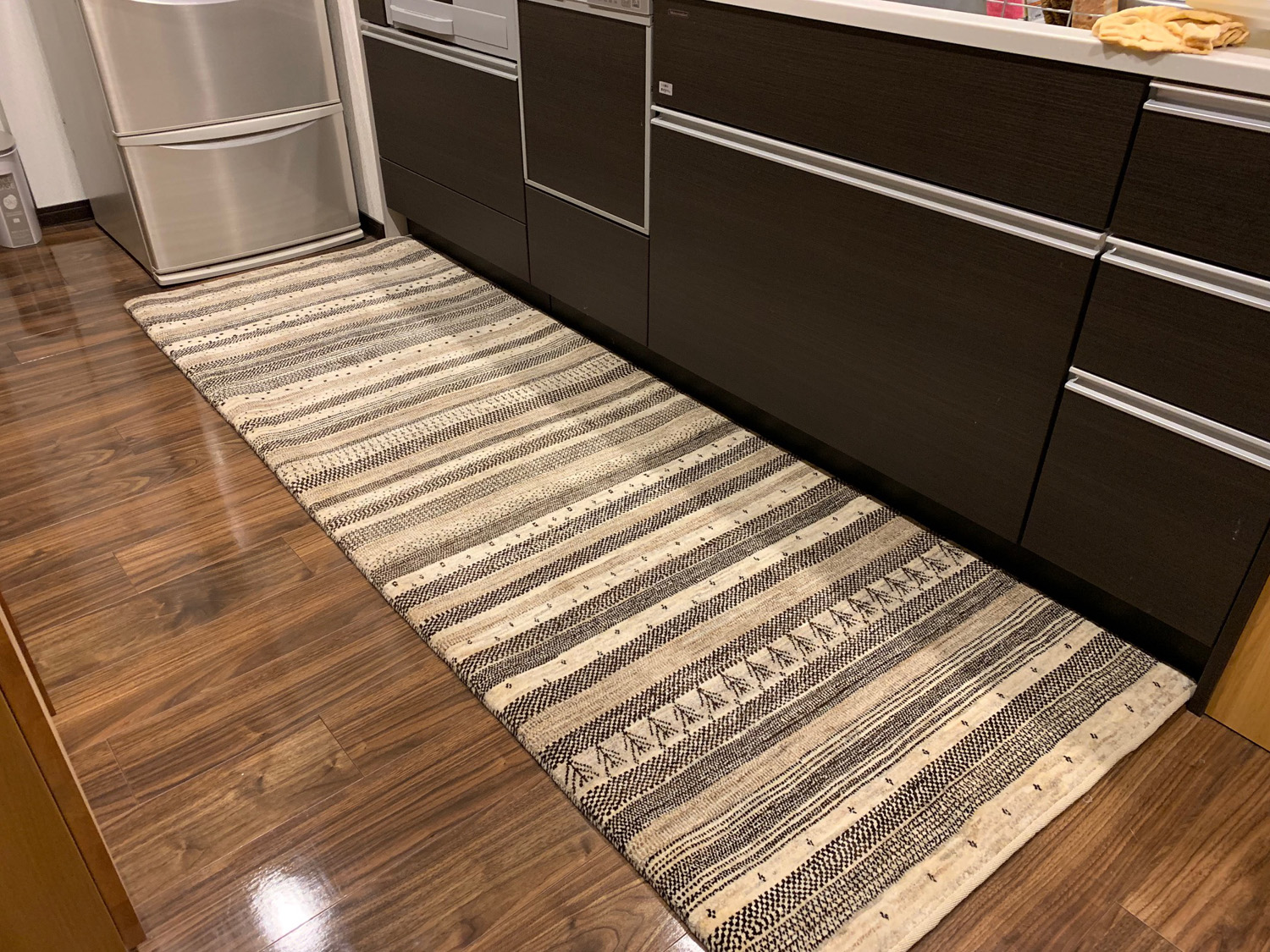 キッチン用には、染めていないナチュラルな羊毛だけで織られた1枚をお選びいただきました。敷いてみるとサイズがぴったりで、「ここで使われるためのアートギャッベだったんだ!」と感動してしまいました。