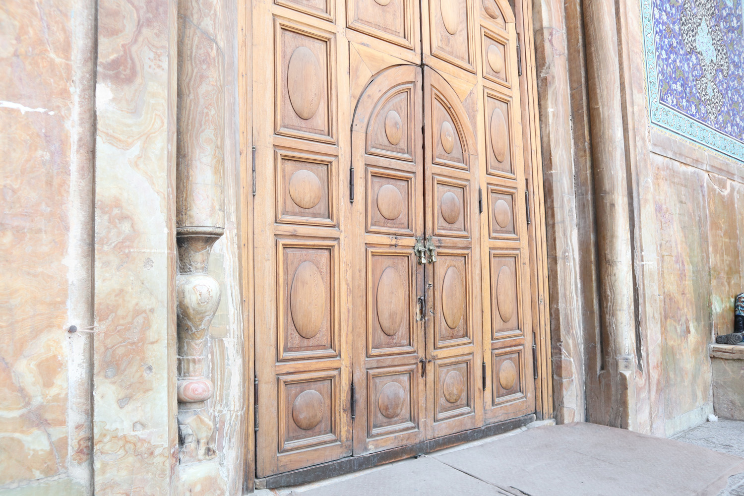 こちらの扉は、両脇の柱の向かって左側だけが飾り彫りを施されています。これは、「完璧にできるのは神様だけで、人間は間違えてしまう」ということを表しているのだそう。扉の上には「神様、上手に造れなくてごめんなさい」という意味の文字も。