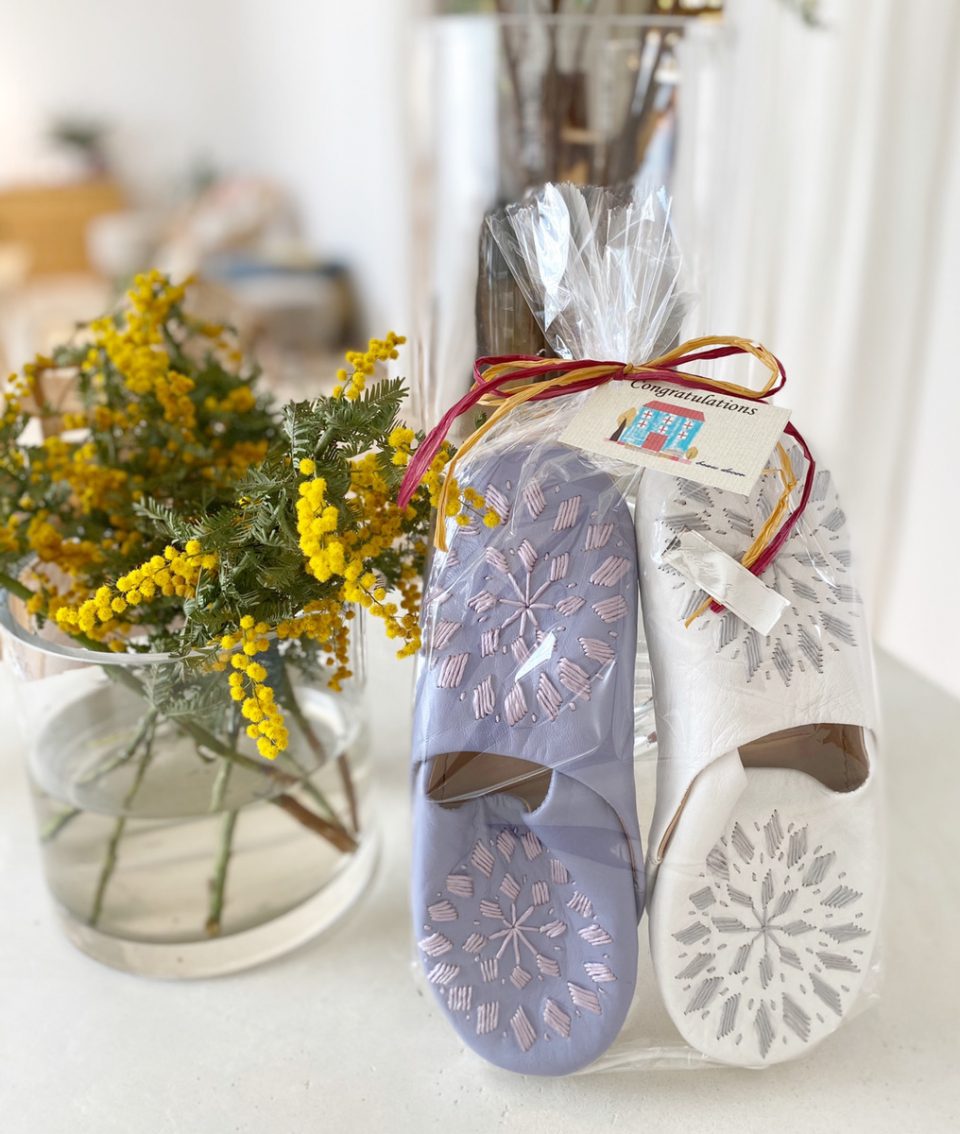 店内にあるバブーシュはヤギ革でできています。ヤギ革はなんといっても柔らかでしなやかな肌触りでそれでいて牛革よりも強いことが特徴です。なので室内履きに最適なんです。ぜひ素足で履いて革の質感を実際に感じていただきたいです。