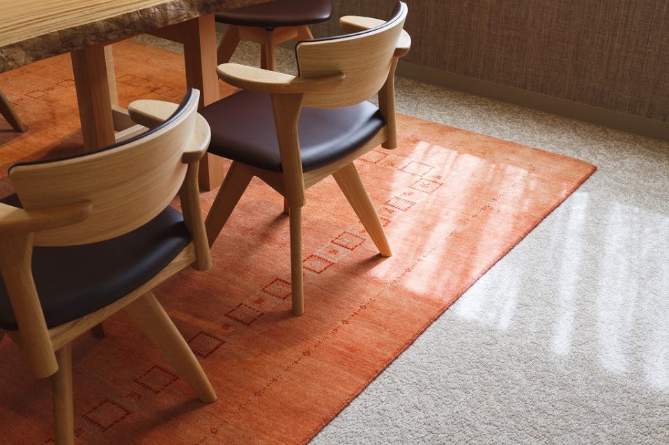 下には、茜色のアートギャッベ。一枚板に合わせて大きいサイズをご提案させていただきました。小さな幸せを呼び込むと願いが籠った「窓」が織り込まれ、縁取っています。自然染料で染まった色は、穏やかで柔らかく、まるで夕日を眺めているときののように心をそっと包み込みます。