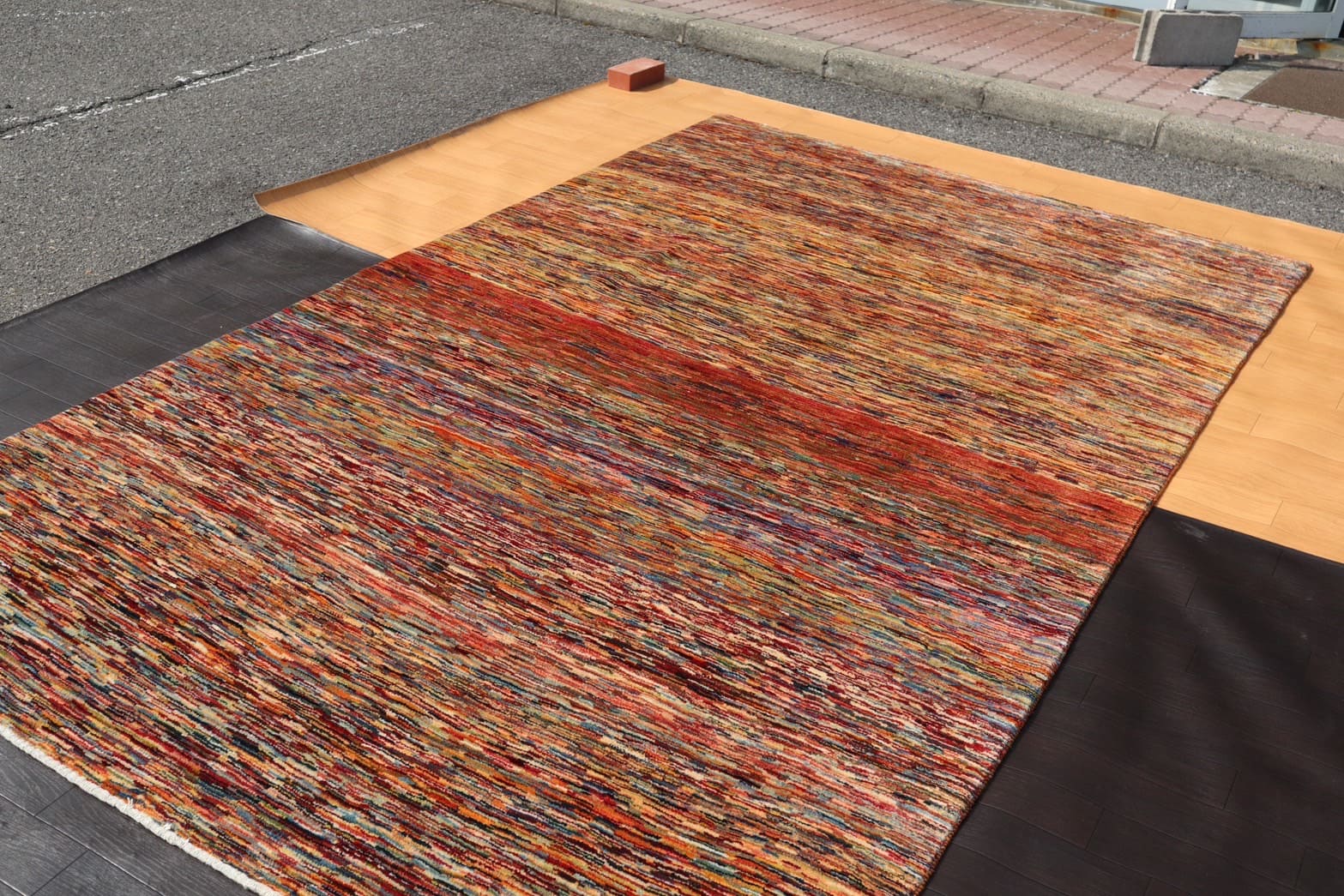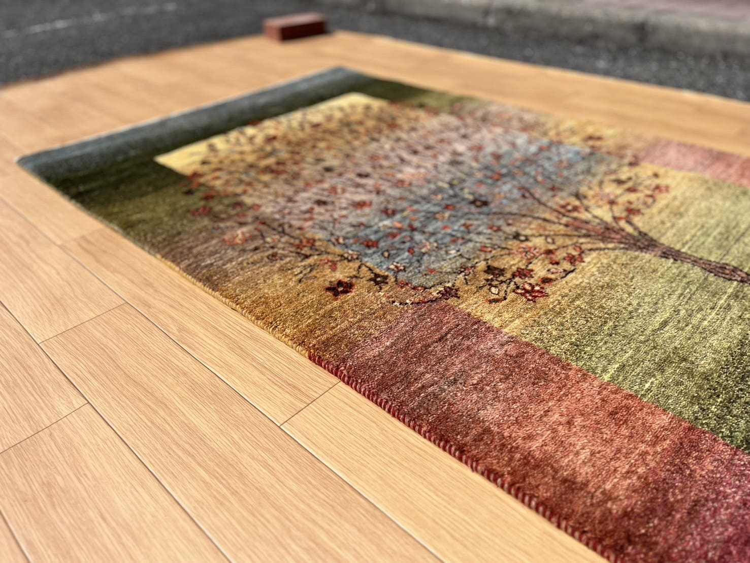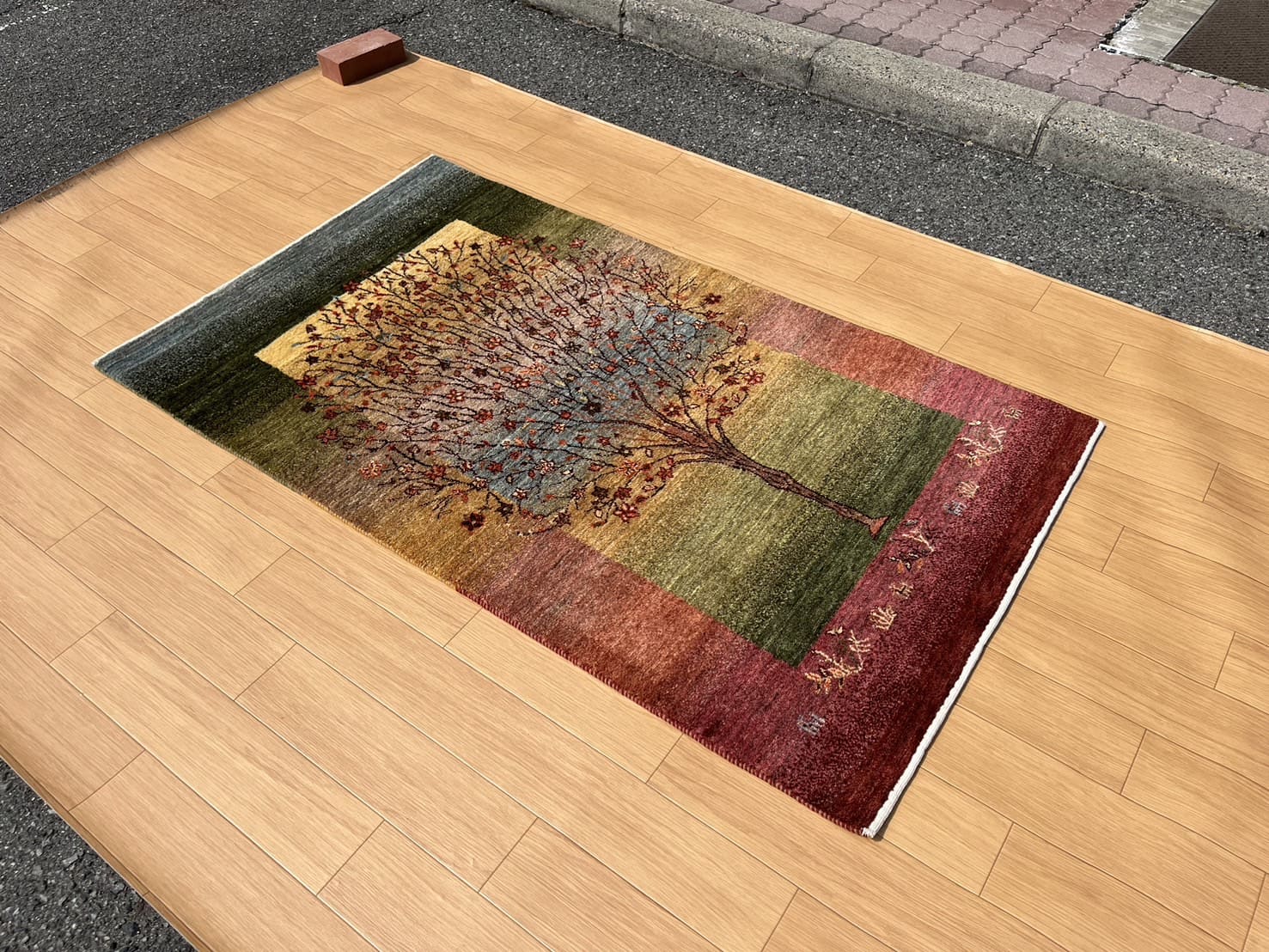 だからこそ、実際に織り子さんが織っていたときに見ていたギャッベに少しでも近い色味や風合いをお見せできたら、織り子さんが伝えたかった気持ちや込めた思い、日々綺麗だなあと感じている景色ももっともっと伝わるのではないかなと、晴れの日は特設コーナーを広げています。