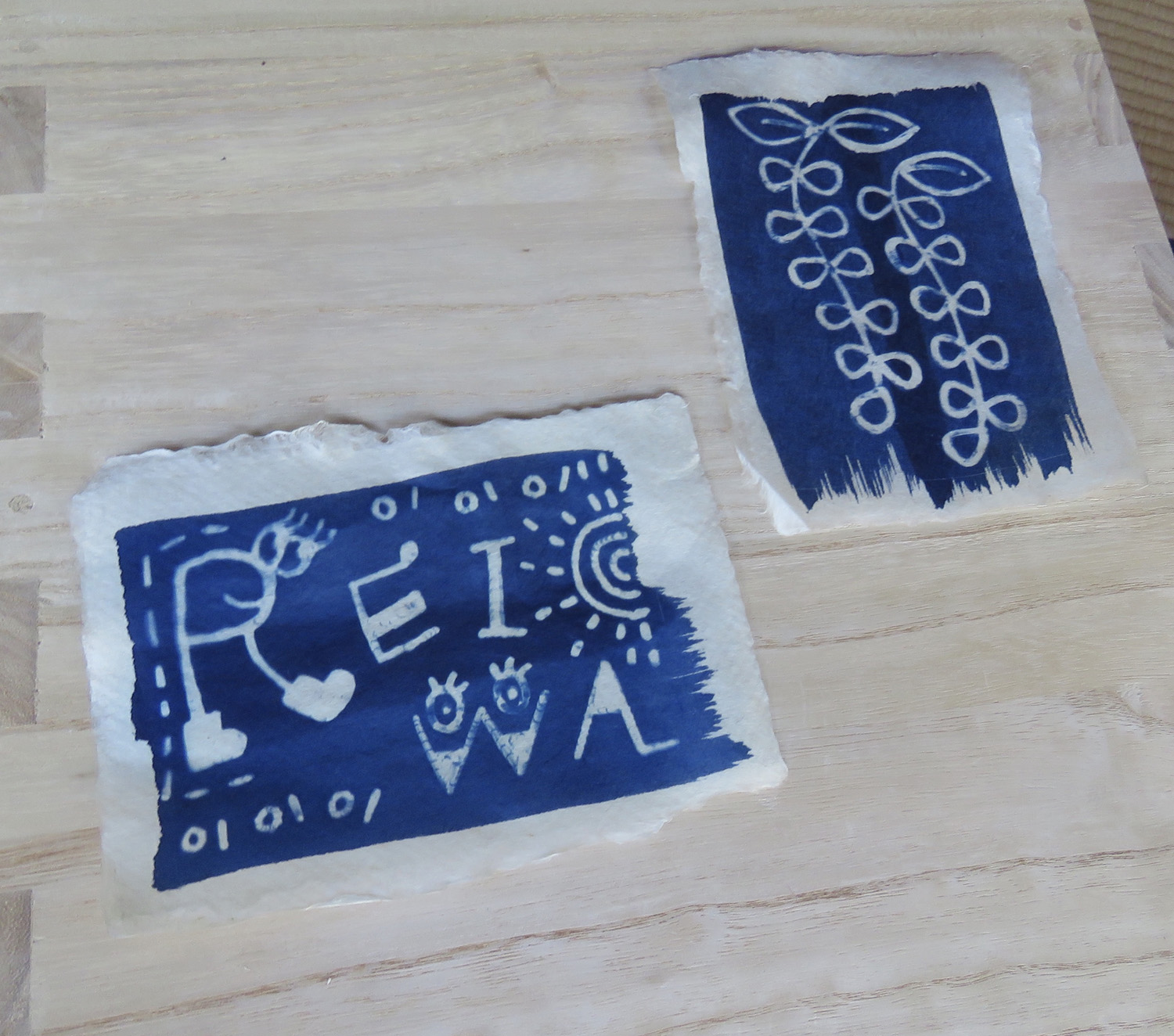 彌彦和紙の上に切り紙やイラストを描いて置き、サイアノタイププリントで作品を作ります。