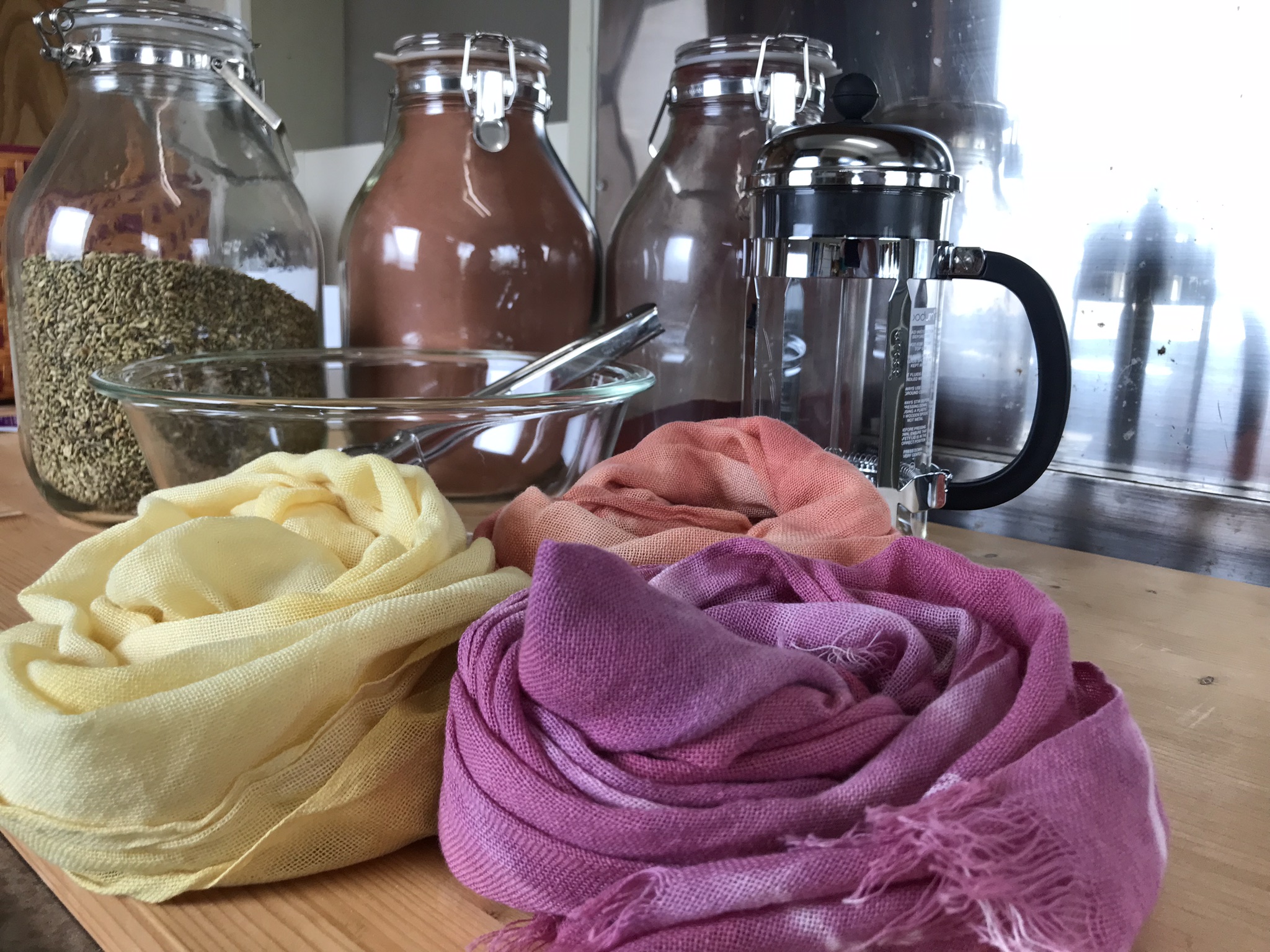 肌触りの良いオーガニックコットンのストールを天然染料で染めます。