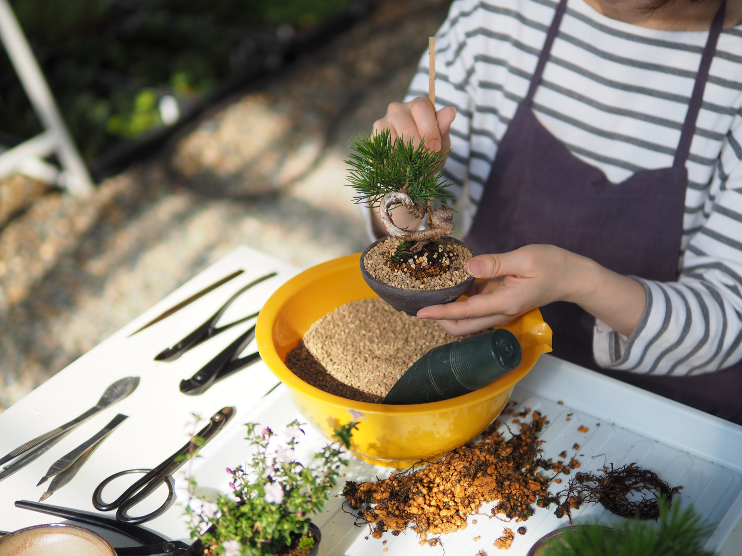気に入った植物、小さな樹と、それに合った鉢を選び、一緒に植え込みをして自分だけのミニ盆栽をつくります。出来た盆栽のお手入れのアドバイスなども。