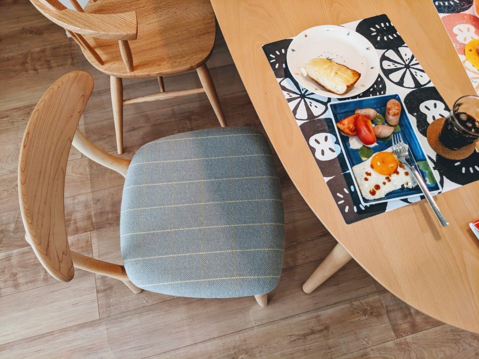 温かみのあるメープル材に、張地は特別仕様でウール素材のグレーのチェック生地をお選びいただきました。北欧テイストの明るいお部屋にとても似合っていてとても素敵でした。