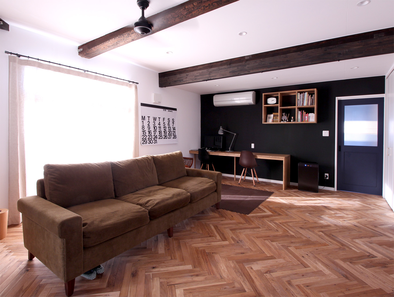ヘリンボーンの床に黒い壁。ブルックリンのような雰囲気でとても素敵です。