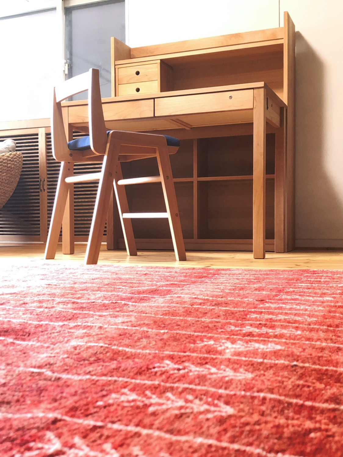 温かみのある優しい色合いの学習デスクに、美しい茜色のアートギャッベにぴったりです。